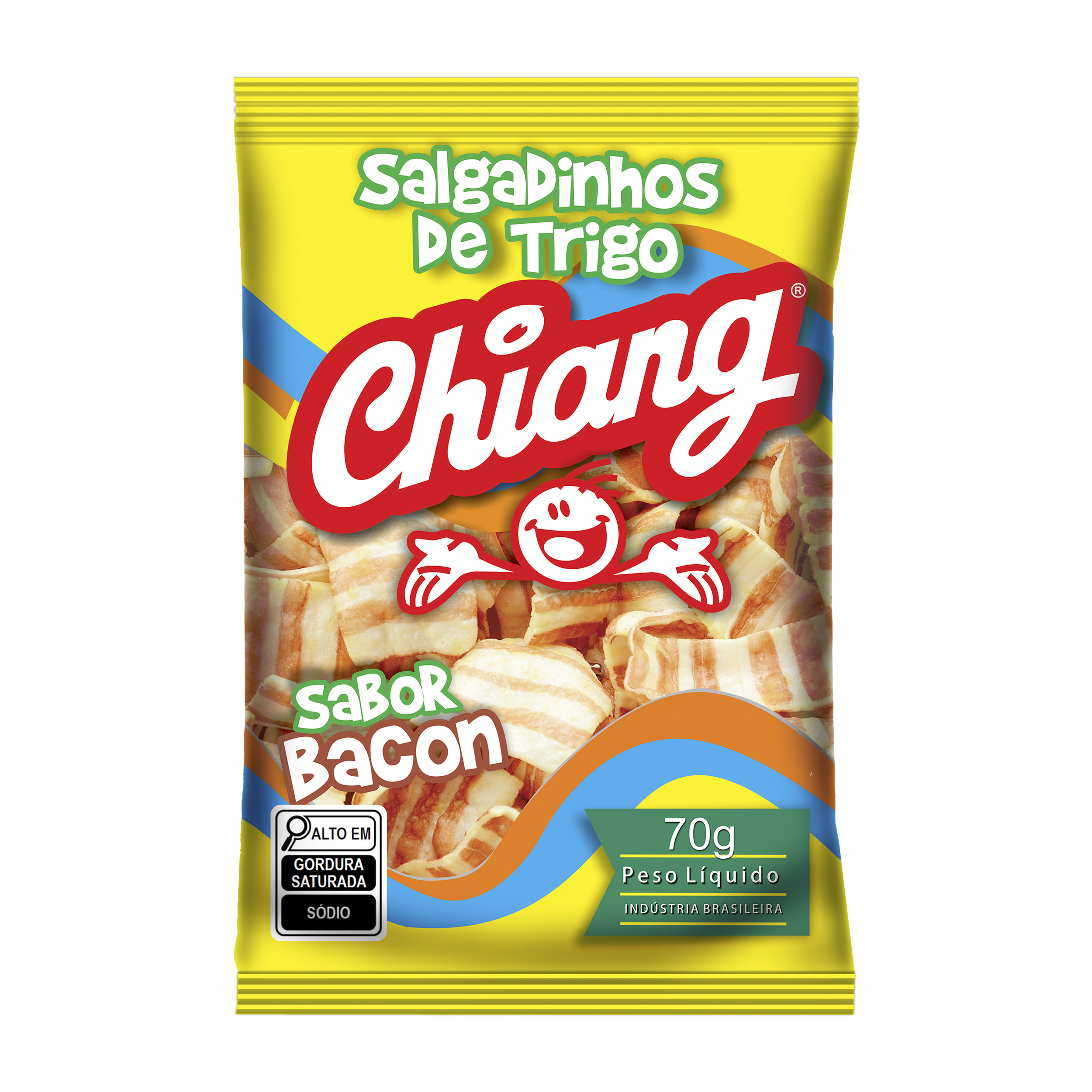 Farinha de Trigo fortificada com ferro e acido fólico, fécula de mandioca, óleo vegetal de soja, sal, condimento preparado sabor bacon, glutamato monossódico e bicarbonato de sódio.